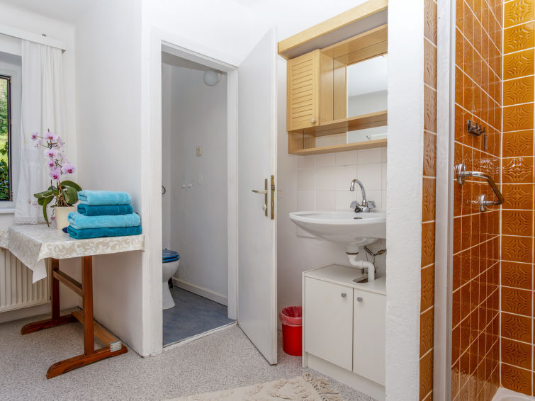 "Carla", 2-Zimmer-Wohnung 86 m2, im Erdgeschoss. Objekt geeignet für 4 Erwachsene + 2 Kinder. Schön und geschmackvoll eingerichtet: Wohn-/Esszimmer mit 1 Doppeldiwanbett (140 cm, Länge 200 cm), Schwedenofen und Esstisch. Ausgang zur Terrasse. 1 Doppelzimmer. Grosse Küche (Geschirrspüler, 4 Glaskeramikplatten, Toaster, Wasserkocher, Mikrowelle, Tiefkühler, elektrische Kaffeemaschine) mit Esstisch. Dusche/WC. Heizung. Parkettboden. Garten. Terrassenmöbel. Sehr schöne Sicht auf den See. Bitte beachten: Nichtraucher-Haus.
