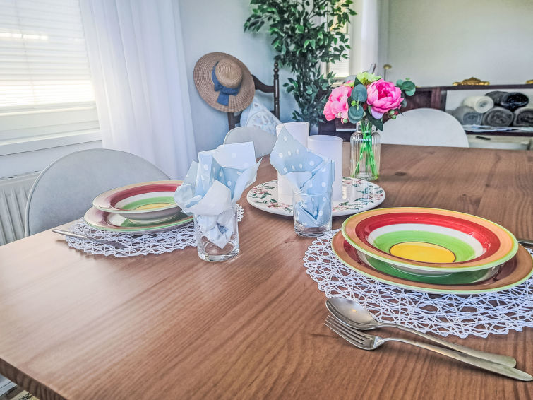 "Rose", 5-Zimmer-Villa 130 m2. Geschmackvoll und romantisch eingerichtet: Eingang. Wohnzimmer. 1 Doppelzimmer. Bad/WC, Sauna. Obergeschoss: Wohn-/Esszimmer mit 1 Doppeldiwanbett, Essecke und Kabel-TV. Ausgang zum Balkon. 1 Doppelzimmer. Kleine Küche (Backofen, Geschirrspüler, 4 Glaskeramikplatten, Toaster, Wasserkocher, elektrische Kaffeemaschine). Bad/WC mit Eckbadewanne. 2. Obergeschoss: 1 Doppelzimmer. Kleine Terrasse, kleiner Garten. Terrassenmöbel. Sehr schöne Sicht auf den See. Zur Verfügung: Waschmaschine, Wäschetrockner, Sauna. Tolle Ausstattung:sep. Wirtschaftsraum (Waschmaschine, Trockner, Bügeleisen), sowie netter Ruheraum mit Home Office Ecke.