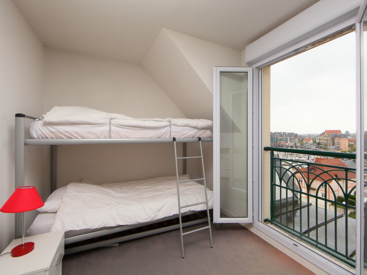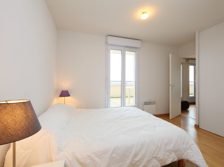 Appartement 4-kamers 66 m2 op 2 verdiepingen op de 5e verdieping, op het noordwesten gelegen. Woon-/eetkamer met TV, Flatscreen TV, stereo-installatie en DVD. Uitgang naar het terras. 1 kamer met 1 2-pers bed (140 cm, lengte 190 cm), douche. Uitgang naar het terras. Kookhoek (afwasmachine, 2 keramische glas kookplaten, broodrooster, waterkoker, elektrische koffiemachine). Aparte WC. Elektrische verwarming, boiler. Bovenverdieping: 1 kamer met afgeschuinde daken met 1 2-pers divanbed (160 cm, lengte 200 cm), TV (Flatscreen TV). 1 kamer met afgeschuinde daken met 1 x 2 stapelbedden (90 cm, lengte 190 cm). Bad/WC. Elektrische verwarming. Parketvloeren. Terras 20 m2, op het noordwesten gelegen. Terrasmeubelen. Panoramazicht op zee, het landschap en de rivier. Ter beschikking: wasmachine. Internet (Internet (WiFi), gratis). Parkeerplaats nr. 1843 (overdekt). Rookmelders.